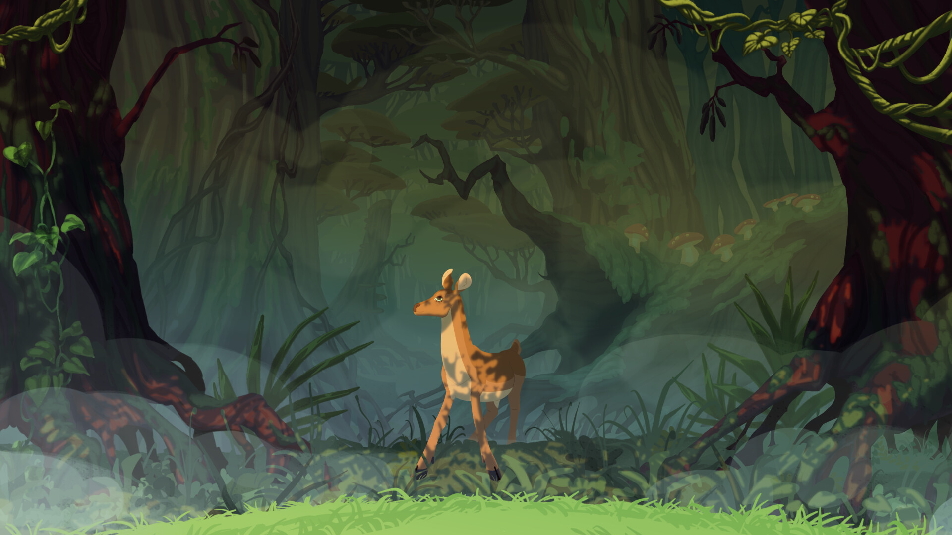 Under a dense canopy, a milk-like nectar flows out of the breast of a statue. Attracted by the frangrance of the mysterious liquid, a deer emerges from the fog.